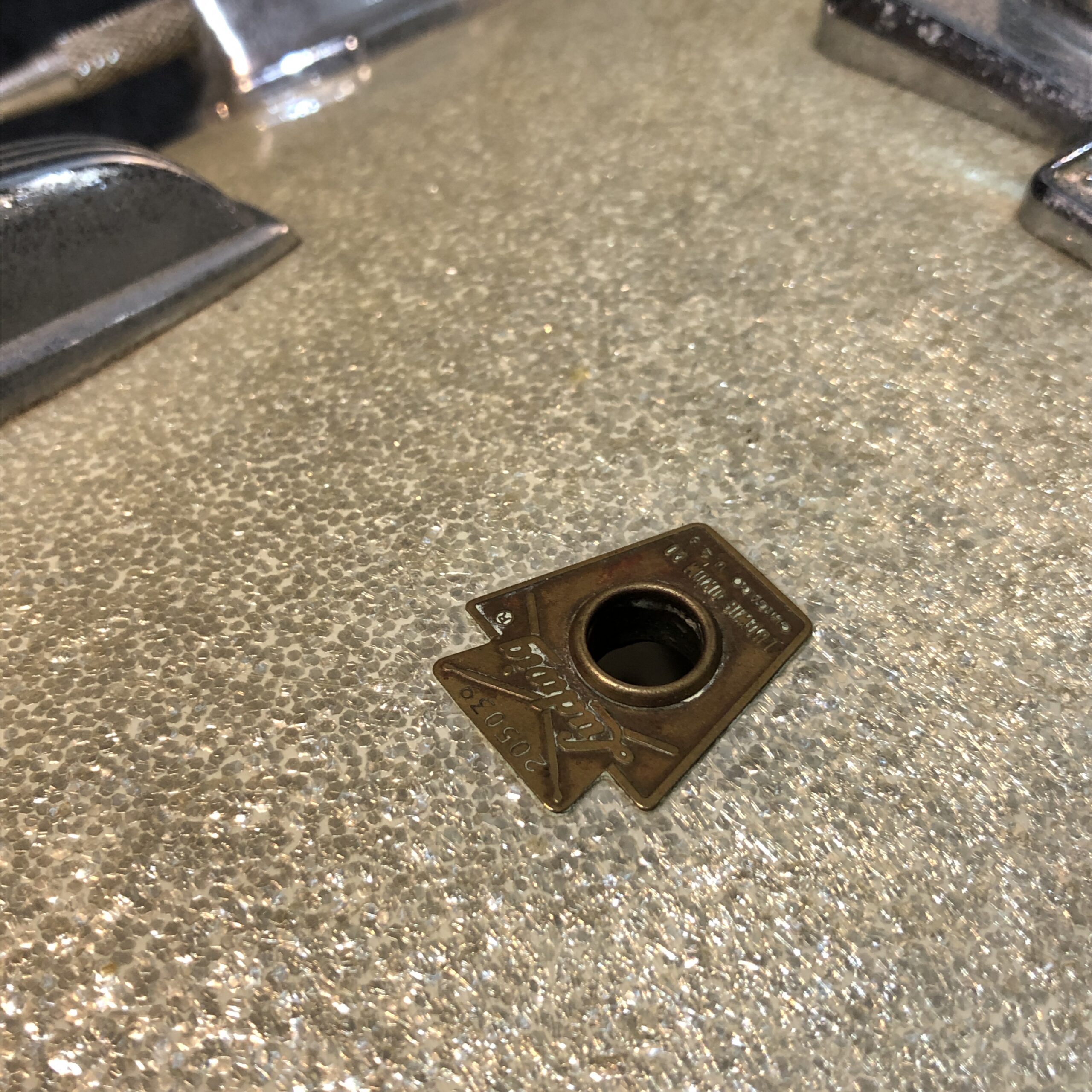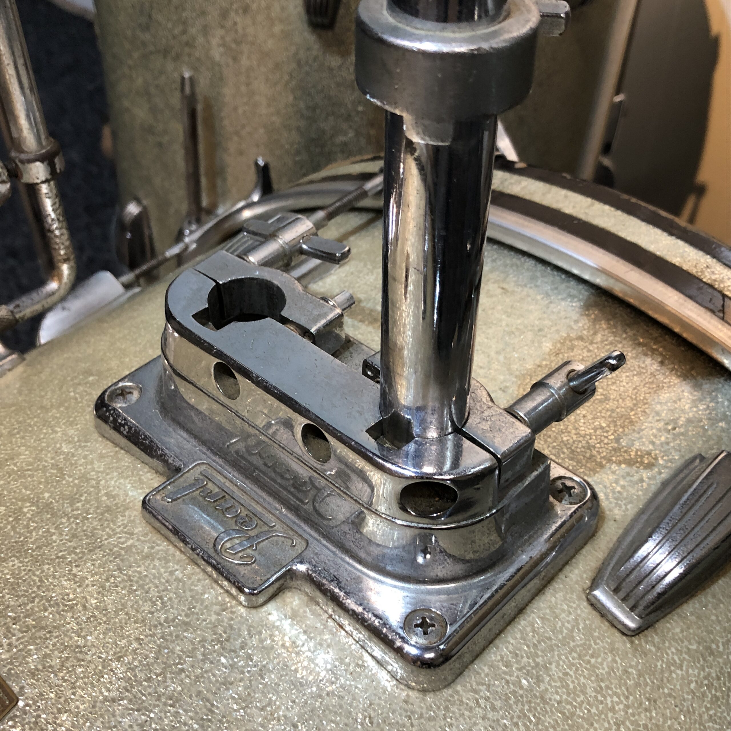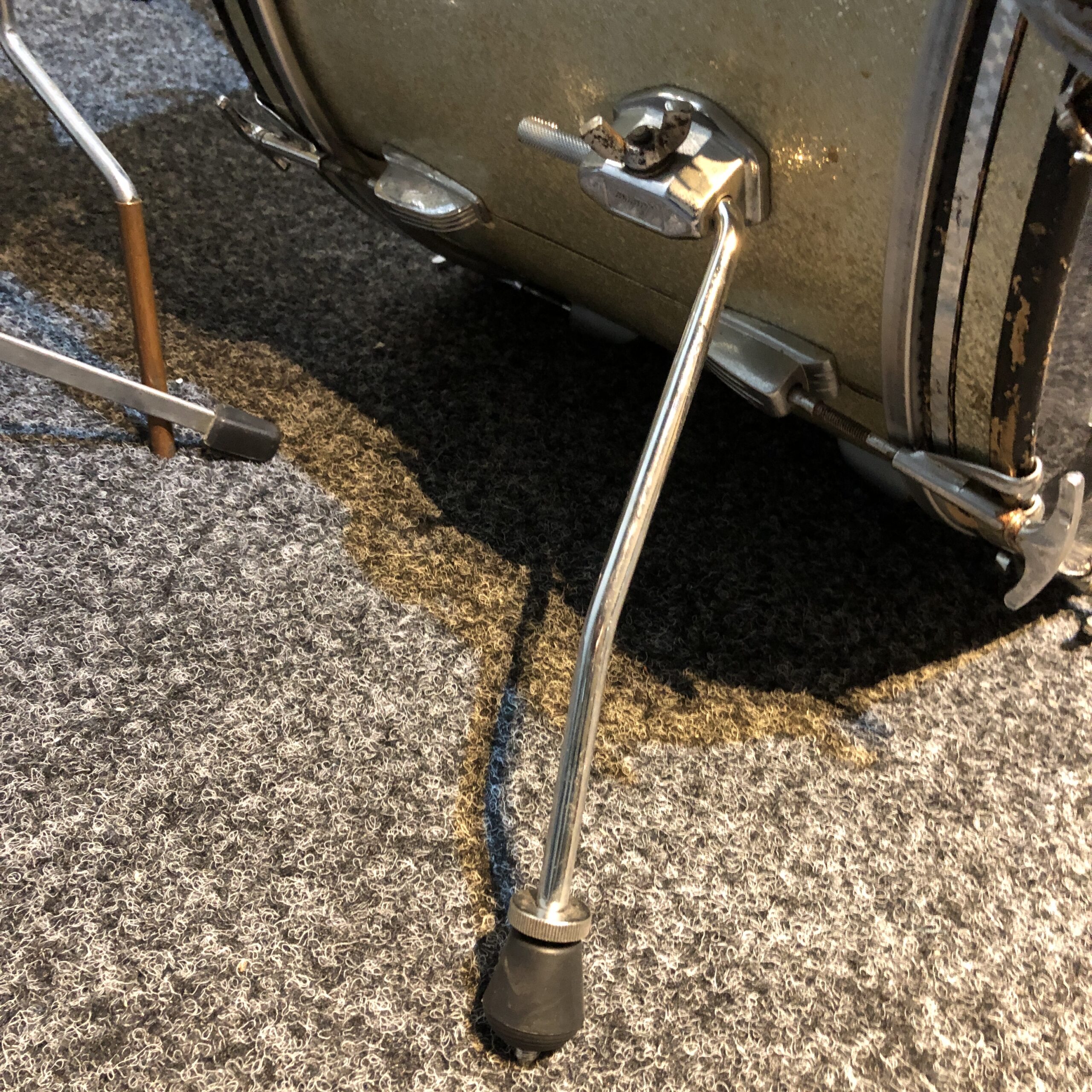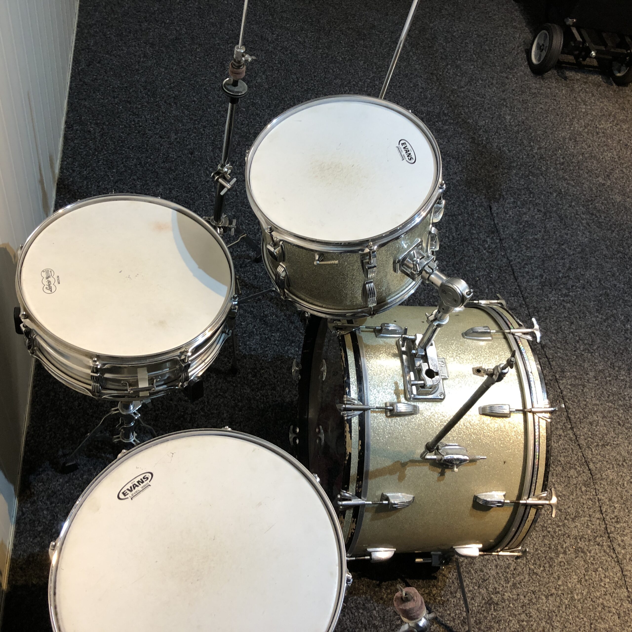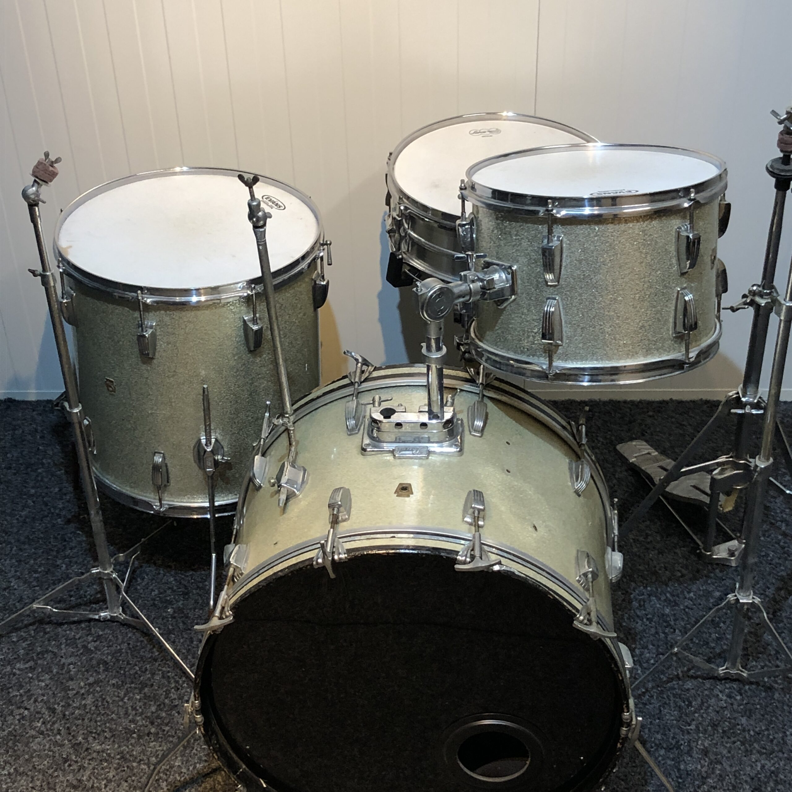 Deze occasion verkeert in gebruikte voor zijn leeftijd, met gebruikssporen die bijdragen aan zijn vintage charme. In de loop der jaren is het een en ander aangepast met niet originele materialen, zoals de bassdrum spurrs en de tombrackt op de bassdrum.