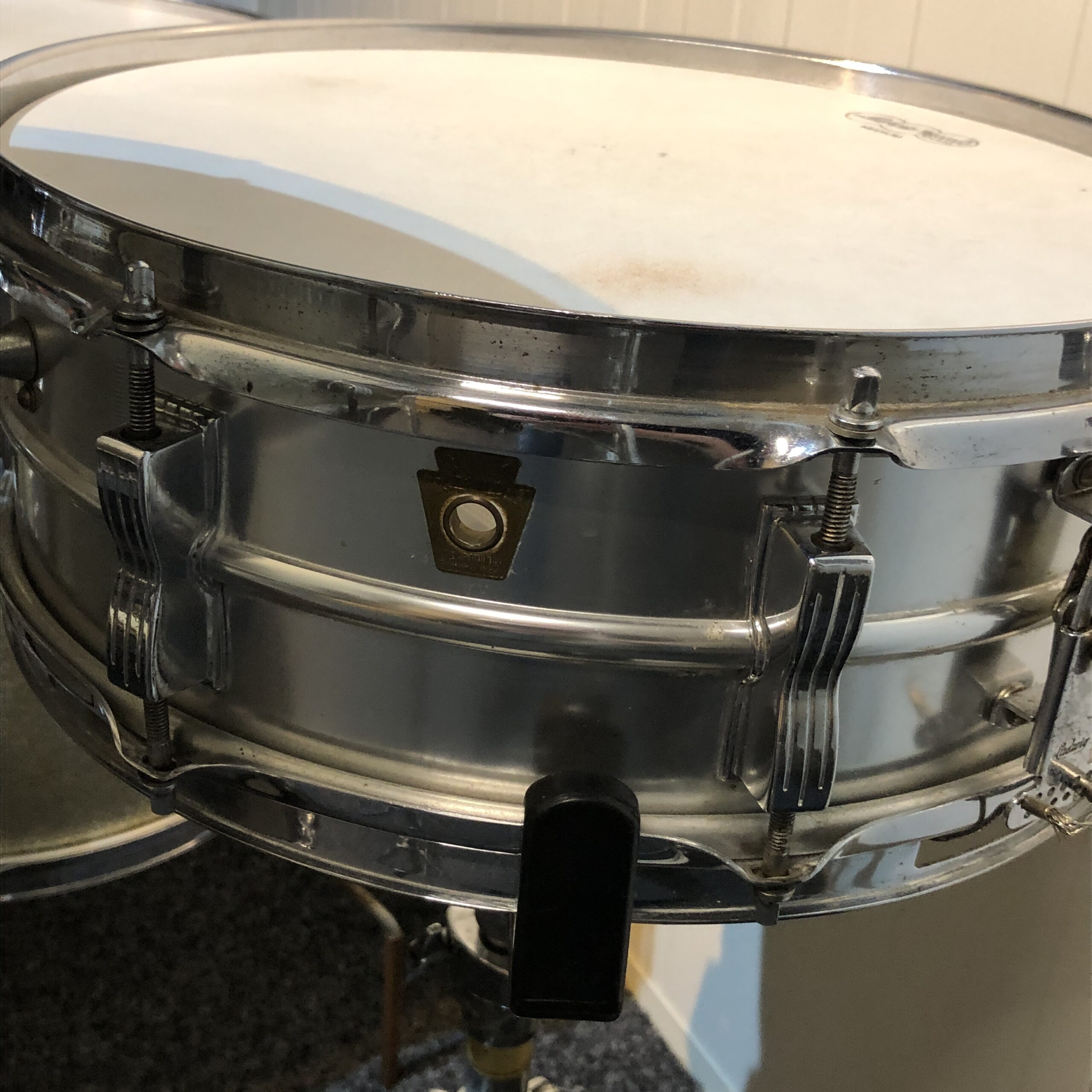 De snaredrum is een vintage Ludwig Accrolite aluminium shell